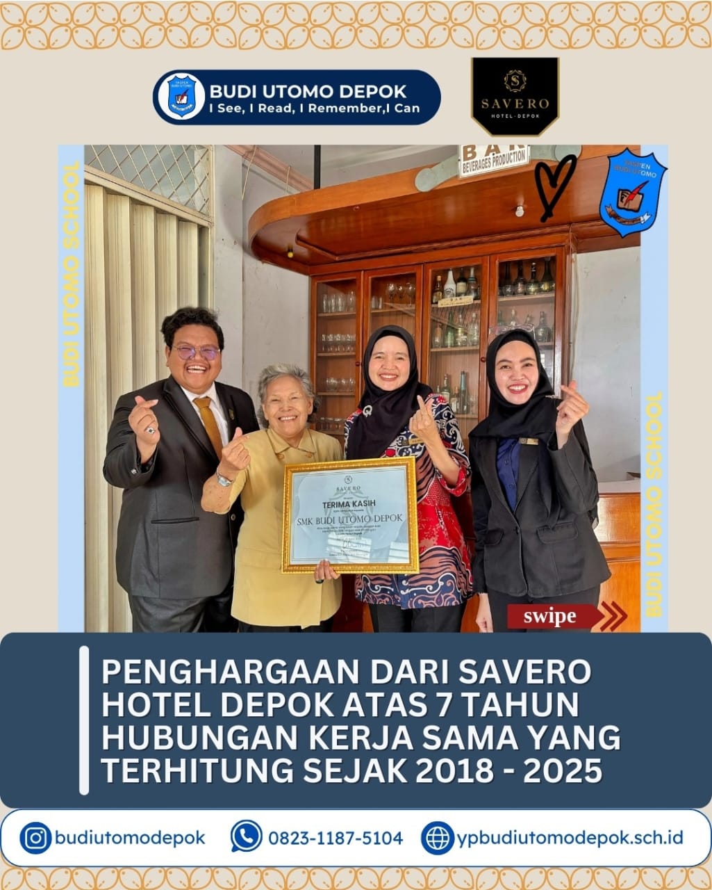 Depok, Mei 2025 — Sebuah momen hangat dan membanggakan terjadi di lingkungan SMK Budi Utomo Depok. Savero Hotel Depok, salah satu mitra dunia industri terkemuka di Kota Depok, secara resmi menyerahkan penghargaan kepada SMK Budi Utomo Depok atas kerja sama yang telah terjalin selama tujuh tahun, terhitung sejak tahun 2018 hingga 2025. Penghargaan tersebut secara […]