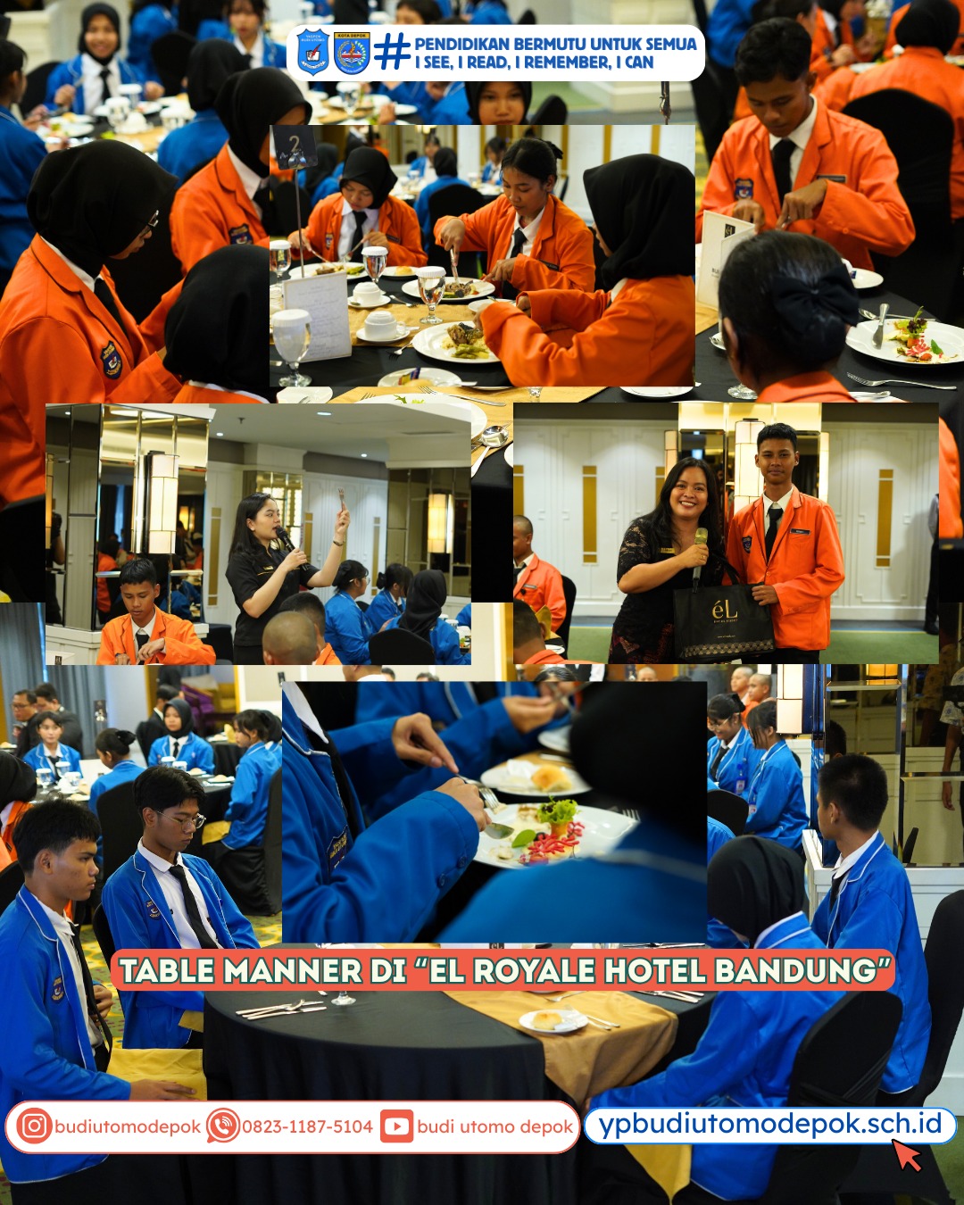 BANDUNG – SMK Budi Utomo Depok kembali membuktikan kualitas pendidikannya di bidang hospitality melalui rangkaian kegiatan bertajuk “Budi Utomo Goes to Bandung”. Siswa Jurusan Perhotelan terjun langsung mengikuti Table Manner Course di hotel legendaris bintang lima, El Royale Hotel Bandung, serta melakukan kunjungan akademik strategis ke Akademi Pariwisata (AKPAR) NHI Bandung. Agenda ini dirancang untuk
