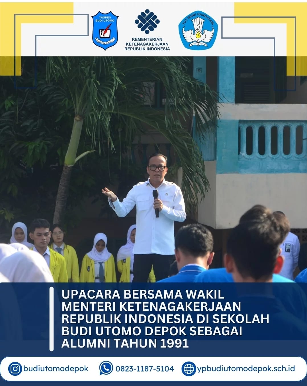 Depok — Senin, 5 Mei 2025 menjadi hari istimewa bagi keluarga besar Yayasan Pendidikan Budi Utomo Depok. Wakil Menteri Ketenagakerjaan Republik Indonesia, Bapak Immanuel Ebenezer, hadir langsung ke kampus SMP, SMA, dan SMK Budi Utomo dalam rangka silaturahmi dan mengikuti upacara bersama para siswa dan guru.